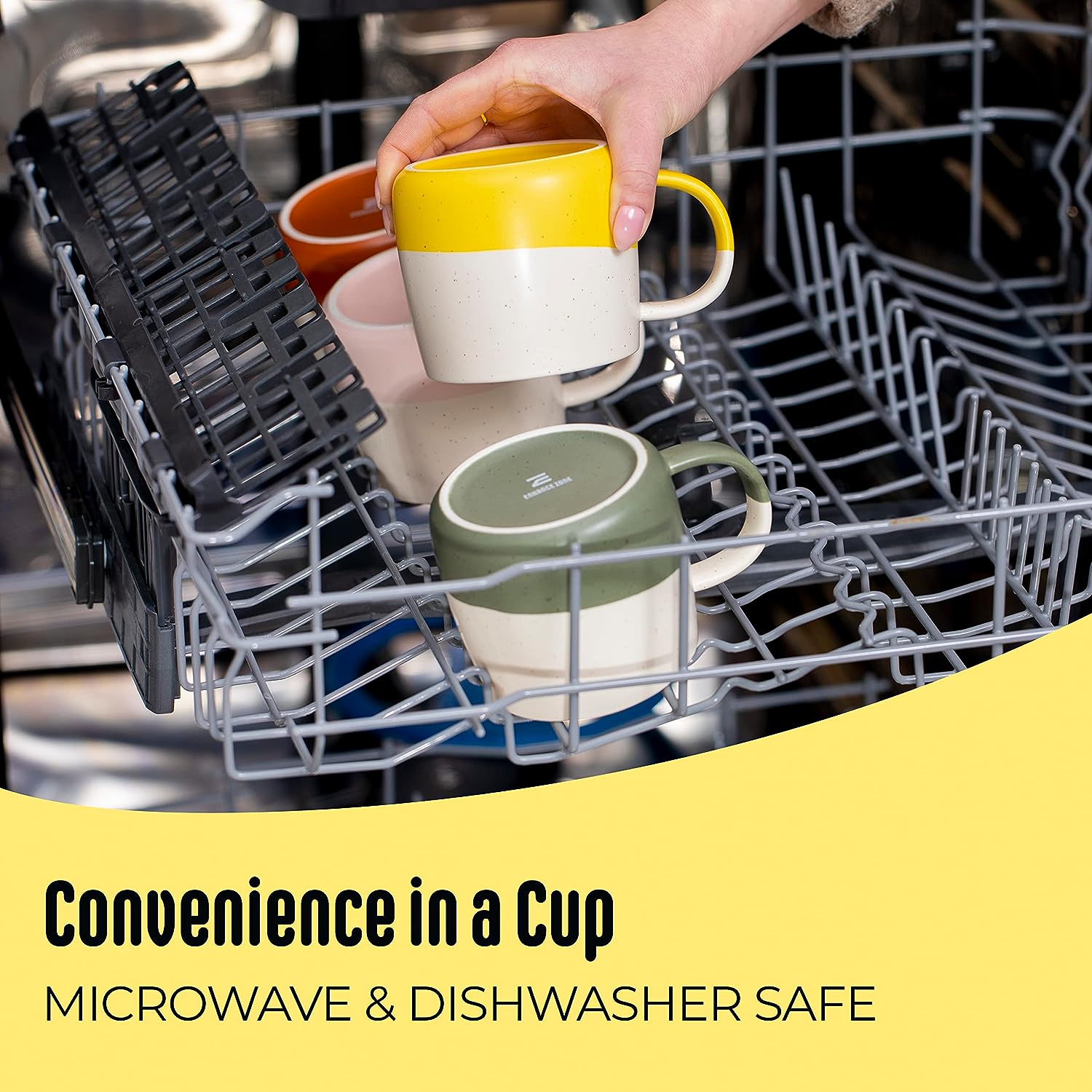 Scandinavian style meets modern design to craft the perfect set of two-tone coffee mugs. Whether curling up with a good book or getting ready for the day, your morning coffee, herbal tea, or latté will taste even better when served in one of these cheerful ceramic mugs. Here’s why this set of coffee mugs from Enhance Zone is sure to become your favorite go-to cup: Two-tone ceramic design Keeps hot beverages hot Comfortable to hold Large capacity Hand-painted speckled glaze 100% lead-free Durable for daily use Dishwasher and microwave safe Packaged to arrive in perfect condition Ceramic Mugs (4) MATERIALS: 100% Ceramic Before you take another sip of coffee or tea from the same old boring mug, order this set of two-tone coffee cups today and treat your beverages (and yourself) to something special.