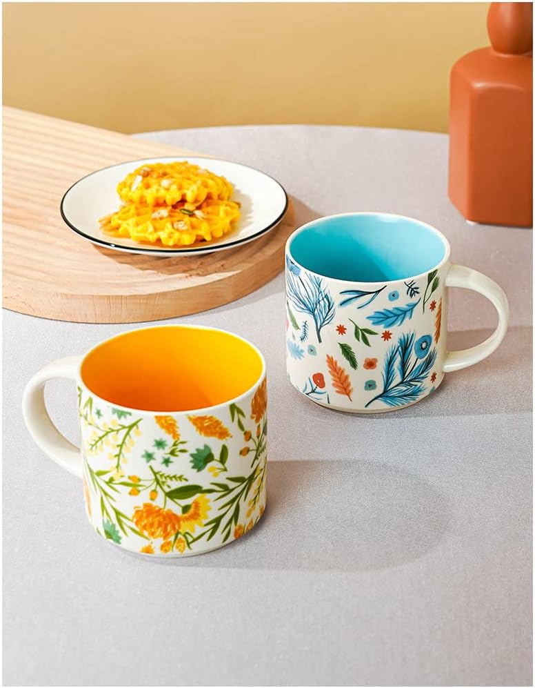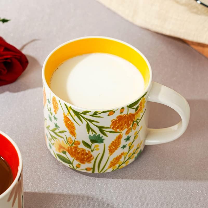 Ceramic Tea Cup Coffee Mug for Office and Home, Hand Painted with Handles, Vintage Flower Blossom Mug, Dishwasher Microwave Safe, Yellow - 15.8oz
