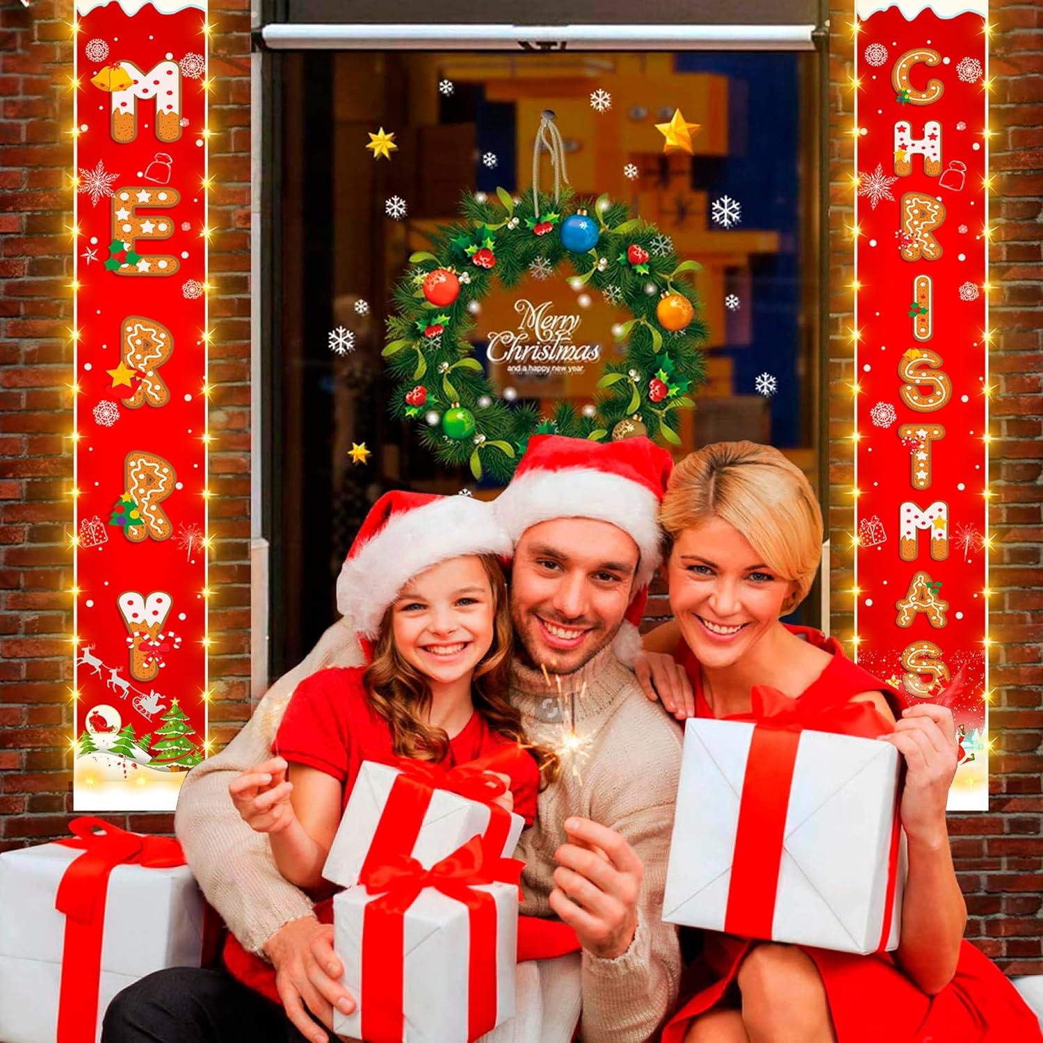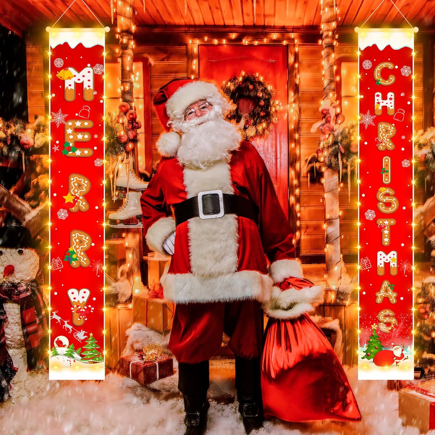 Christmas Decorations Banners with String Lights, Cookie Pattern Merry Christmas Party Decor, Bright Red Xmas Hanging Banner for Outdoor/Indoor Home Front, 600D Fabric Porch Sign