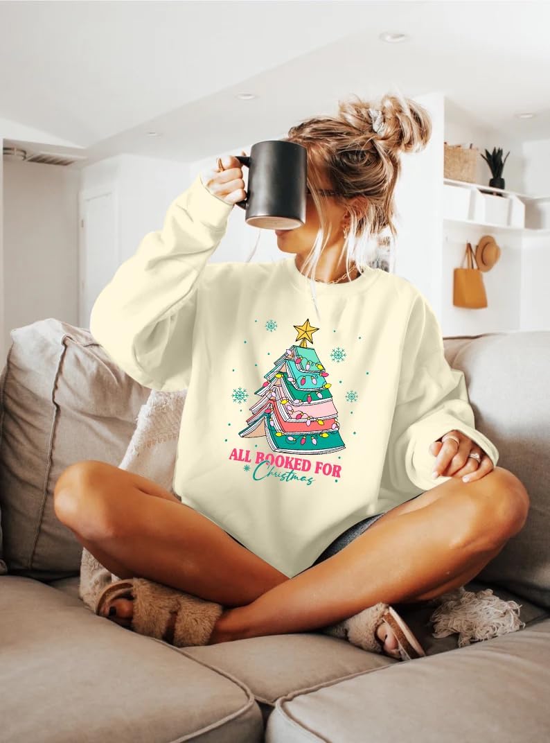 Christmas Sweatshirts for Women All Booked Christmas Sweater Funny Merry Sweatshirt Xmas Holiday Long Sleeve Pullover