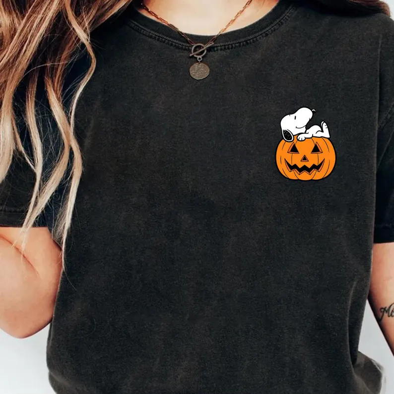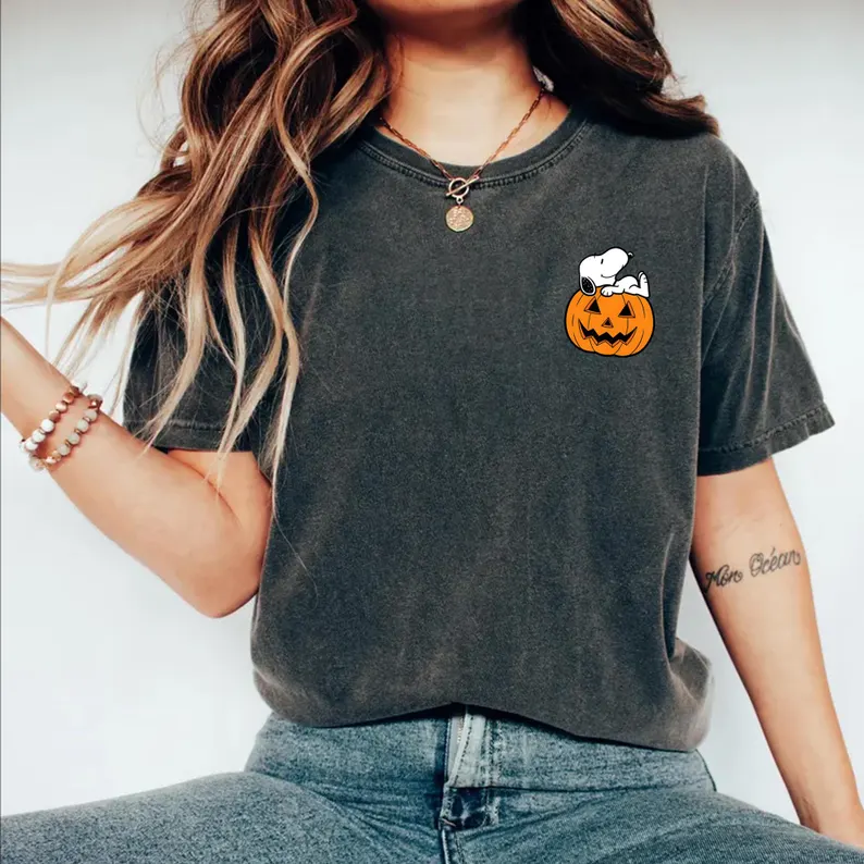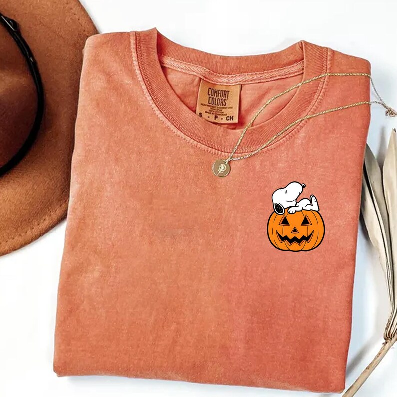 Bring playful fall vibes to your wardrobe with this cute Halloween pumpkin shirt featuring an adorable dog resting on a carved jack-o’-lantern. Perfect for spooky season outfits, this cozy Halloween tee is great for casual days, pumpkin patch visits, trick-or-treat night, or festive fall gatherings.